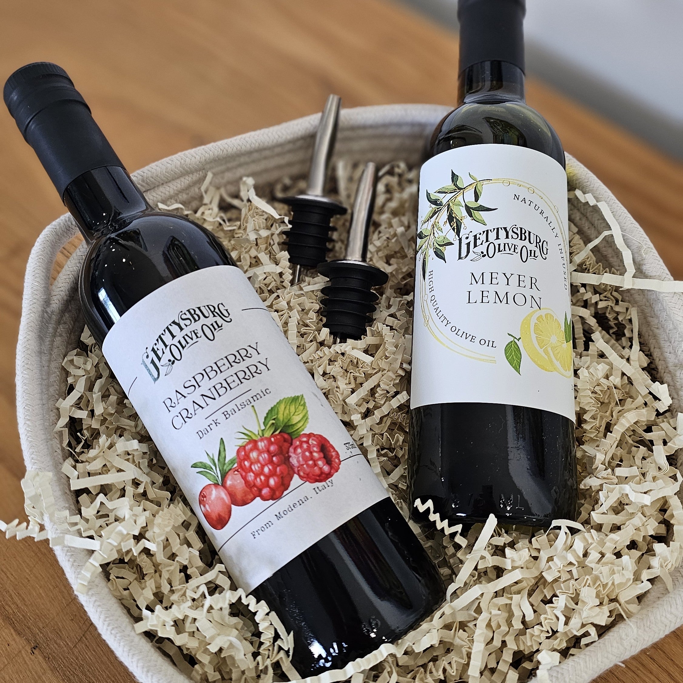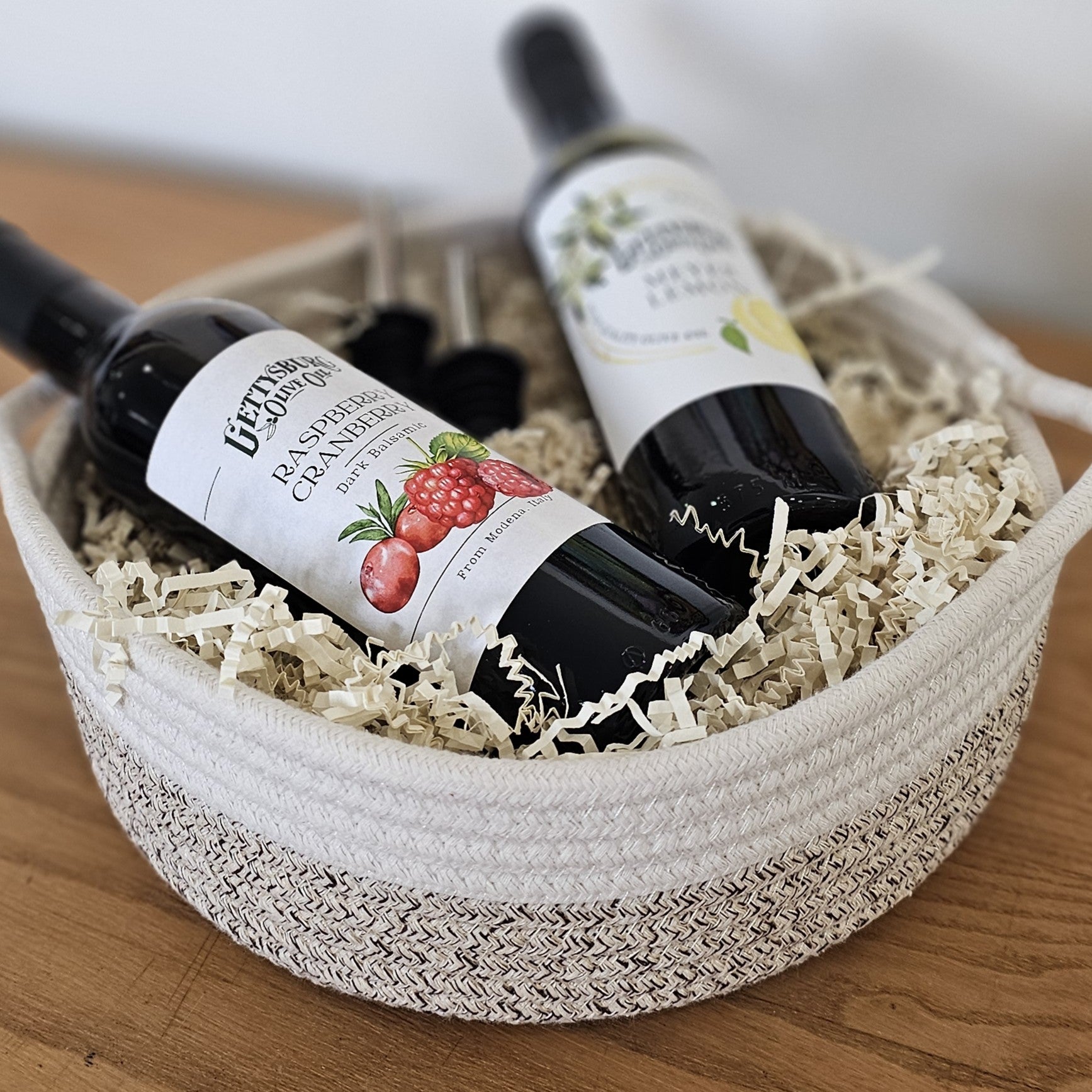 A beautiful presentation for a truly special gift. This woven basket (10"D x 10"W x 3.5"H) holds two full-size 375 ml bottles of your choice—choose any extra virgin olive oil or balsamic vinegar to create a personalized pairing (specify in comments at checkout). A thoughtful and impressive gift for weddings, holidays, and gourmet food lovers.