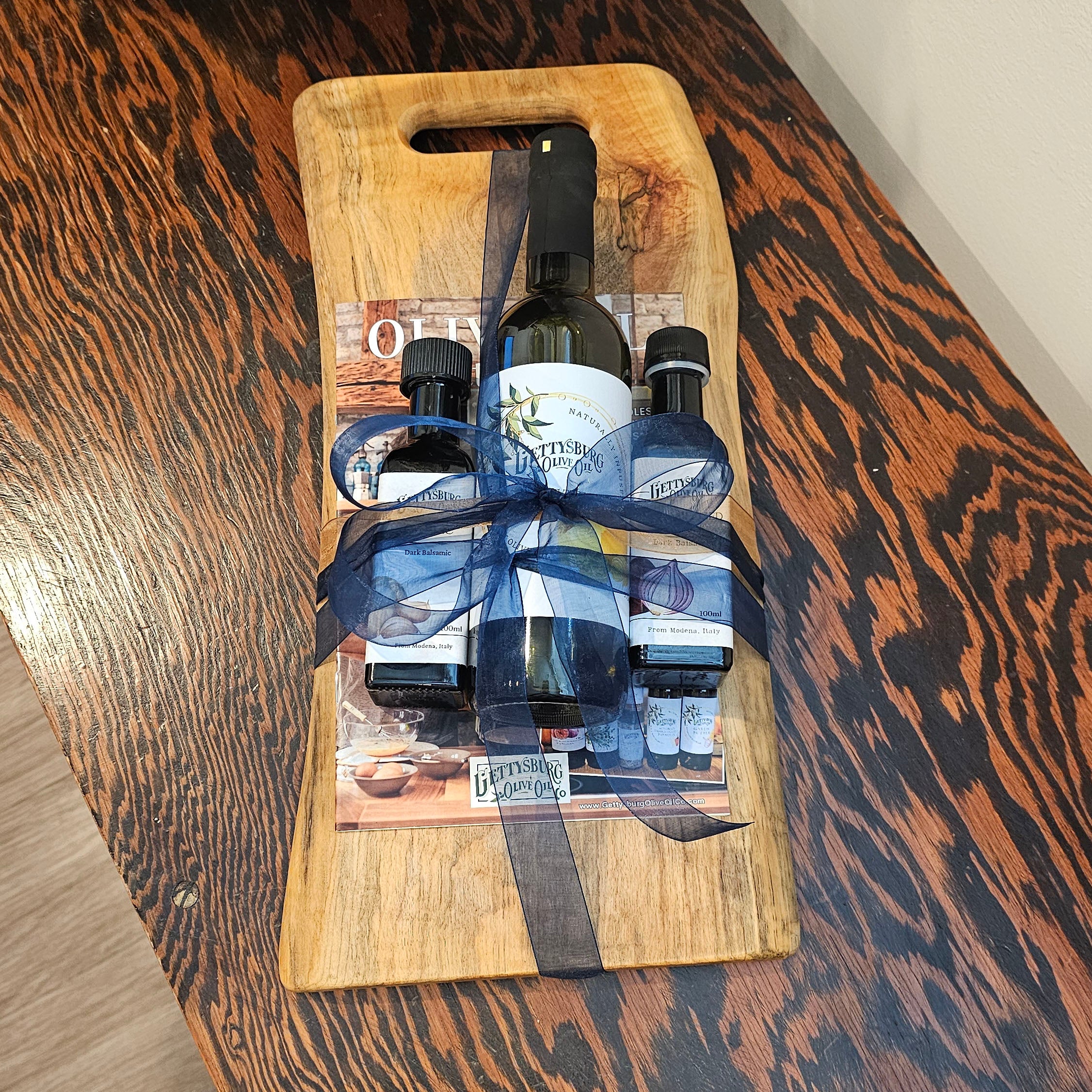 Arranged on a solid wood cutting and serving board (8" x 15.5"), this set features a full-size bottle of our premium Extra Virgin Olive Oil paired with two complementary 60 ml balsamic samplers. Together, they create the ultimate bread-dipping trio—ideal for Italian night, charcuterie boards, salads, and everyday gourmet cooking.